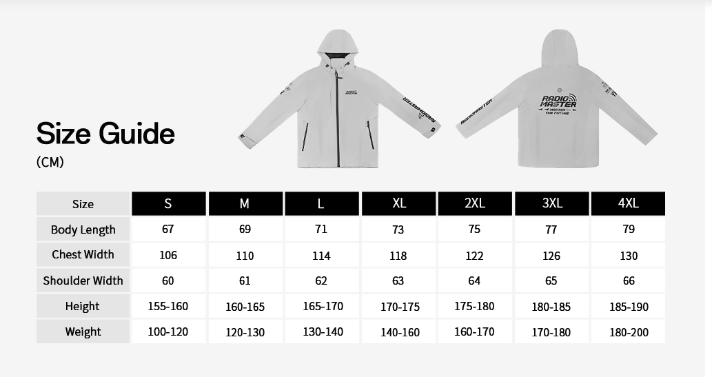 Demuestra tu pasión por el radiocontrol dondequiera que vayas con la chaqueta ligera RadioMaster. Esta chaqueta cuenta con un diseño elegante y moderno, y un revestimiento ligero que te mantiene seco y cómodo. Es resistente al viento, repelente al agua y perfecta para el uso diario, ya sea en el campo o en la ciudad. La chaqueta luce prominentemente el logotipo de RadioMaster en el frente, junto con logotipos adicionales de Multi, EdgeTX y ExpressLRS en las mangas y la espalda. En la parte inferior de la espalda, justo debajo del gran logotipo de RadioMaster, se encuentra el llamativo eslogan: «Domina el futuro».